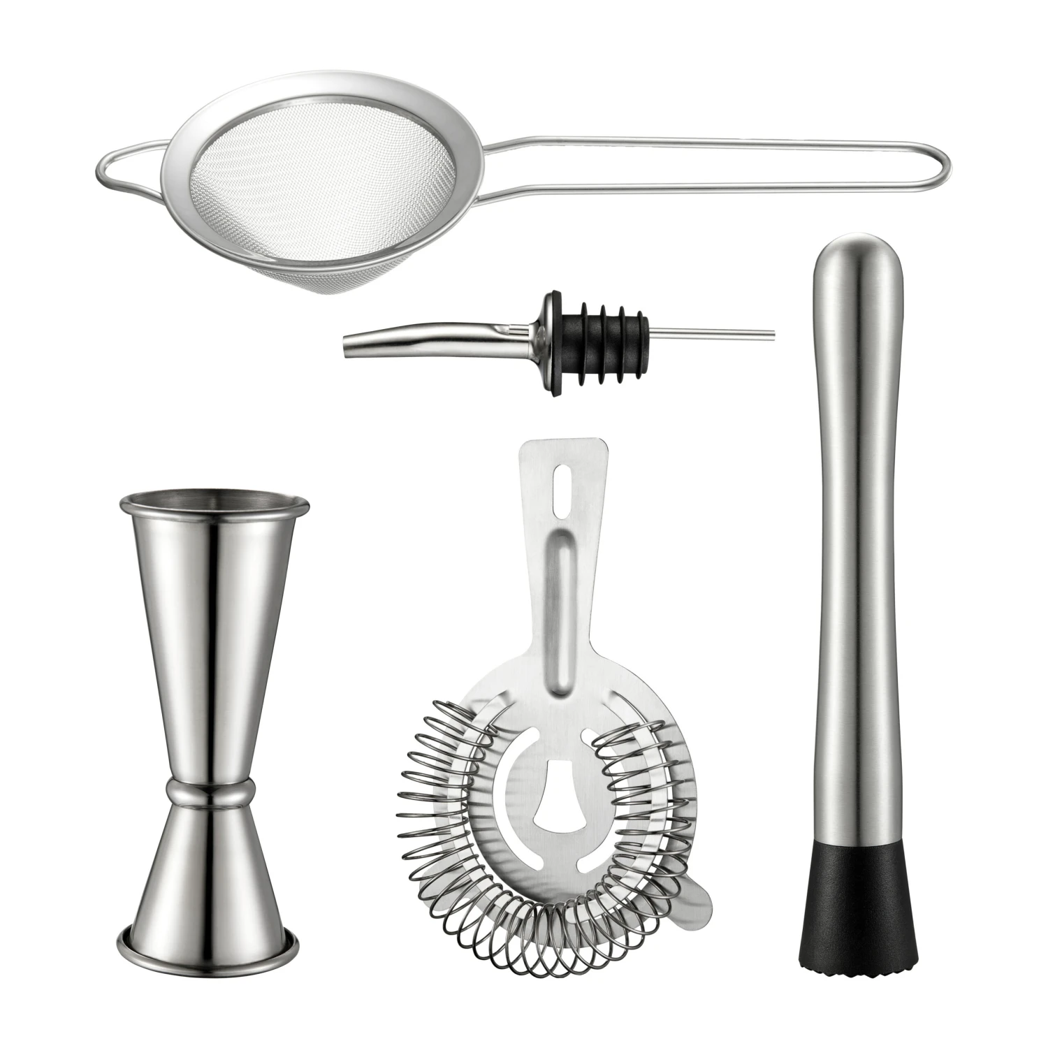 - Inbegrepen onderdelenZeef 23 cm, Muddler 21 cm, Cocktailzeef 14,5 cm, Maatbeker 3-5 cl, Schenktuit 11 cm
